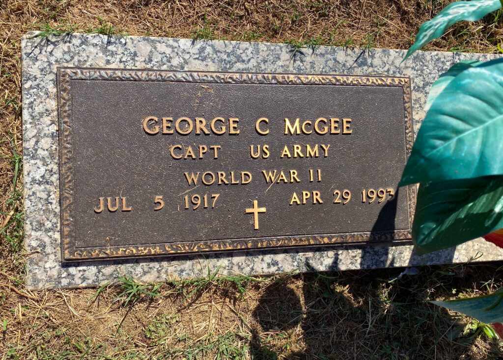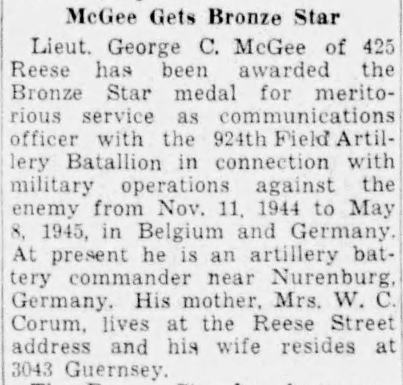 George Carlton McGee (5 Jul 1917 – 29 Apr 1993) served during World War II after enlisting on 19 Nov 1942, and was later discharged on 6 Aug 1946. A newspaper notice reports that Lt. George C. McGee was awarded the Bronze Star Medal for meritorious service as a communications officer with the 924th Field Artillery Battalion, in connection with operations against the enemy from Nov. 11, 1944 to May 8, 1945, in Belgium and Germany.